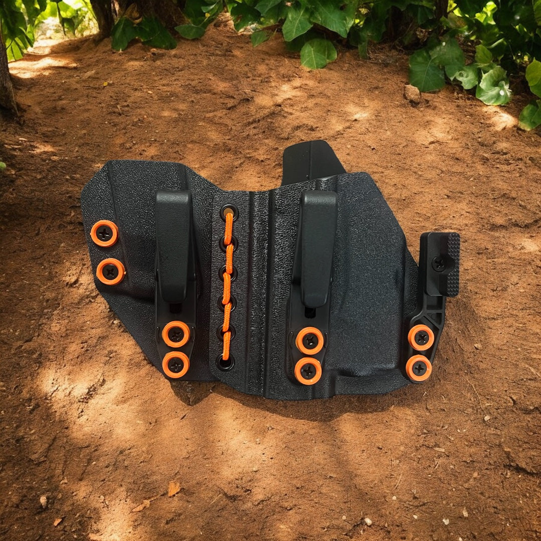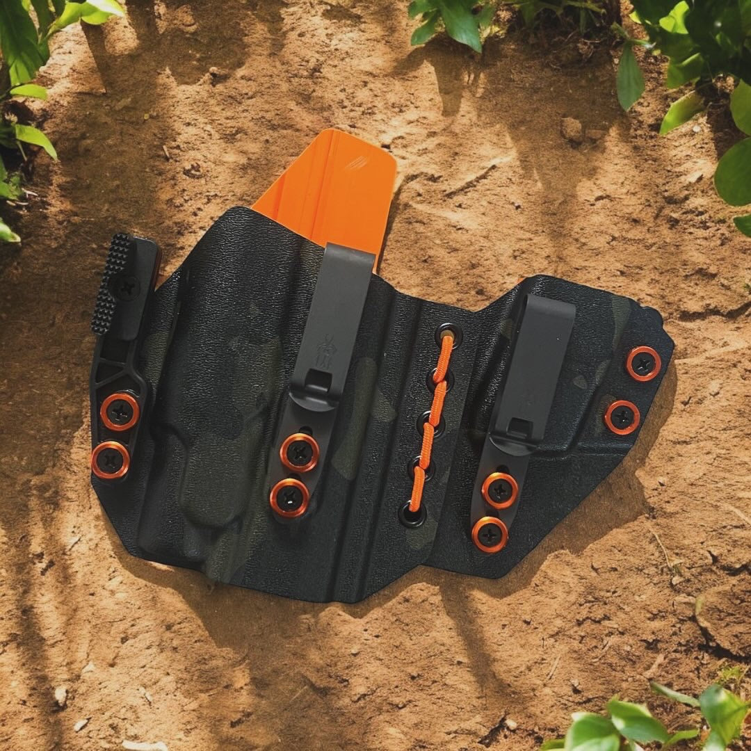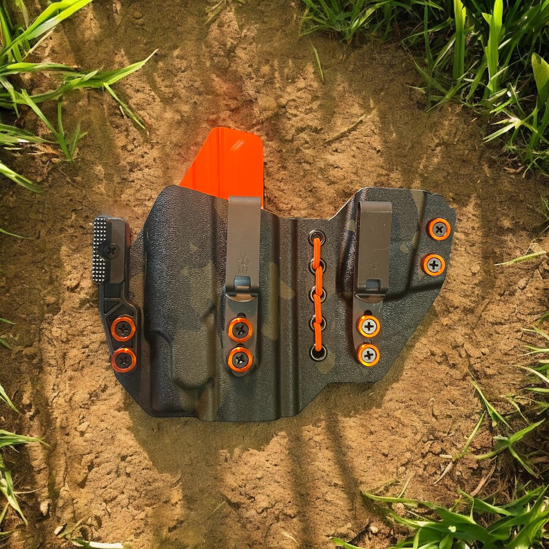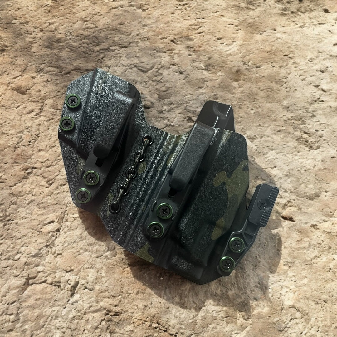AIWB Sidecar Holster 2.0 - Light Bearing: Here at Modern Patriot Holsters we take pride in giving our customers the absolute best in customized holster options. Our AIWB Sidecar Holsters are truly a work of art! We offer several kydex color options including carbon fiber and much more. Coupled with a multitude of belt attachment options to make your holster as simple or as complex as you desire. We finish each holster with your choice of colored finishing washers and screws. Stop searching for ordinary and make a holster that stands out of the crowd!