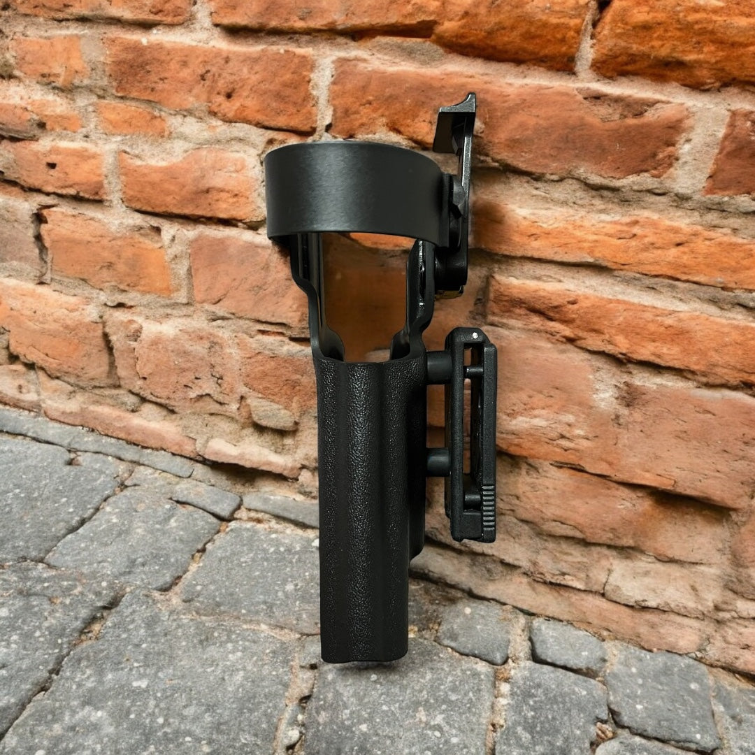 Speed Lock Level 2 Retention System: Is Produced by Spetz Gear and has clear advantages over similar options currently on the market. This patent pending design allows for a secured closed retention (Level 2) hood, meeting many large professional agencies' holster requirements. The SpeedLock Gen 2 carries over the proven release mechanism from the original with an improved top strap featuring an increased thickness from .060 to .093 and reinforced pivot points. The thumb release is sized and positioned for repeatable positive activation of the release while securing a firm grip, all in one single motion. No additional grip adjustments need to be made prior to, or after the drawing of the pistol. The smooth action thumb release activates the spring-loaded hood in a fraction of a second. This allows for the handgun to be immediately drawn as soon as the grip is secure. This is much different from other designs, which require the depressing of the lock release followed by a forward movement by the user to secure the grip. The rearward unlocking motion saves valuable spacing between the retention system and the mounting platform. Because it does not require the thumb to push down and outward (toward the body), this retention is ideal for mounting on a chest rig/vest carrier system.