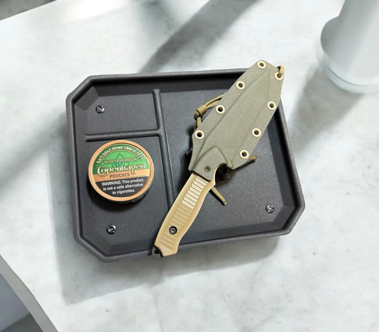 EDC Dump Tray: Our custom designed EDC Dump Trays feature premium kydex for maximum rigidity and style. Easily dump all your EDC items as you walk in the door. We offer a wide range of styles and a dual layered option to make a truly one of a kind dump tray you can be proud of. Each dual layered dump tray comes with your choice of screw and finishing washer options to further customize your tray.