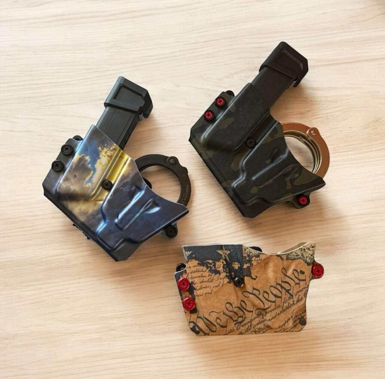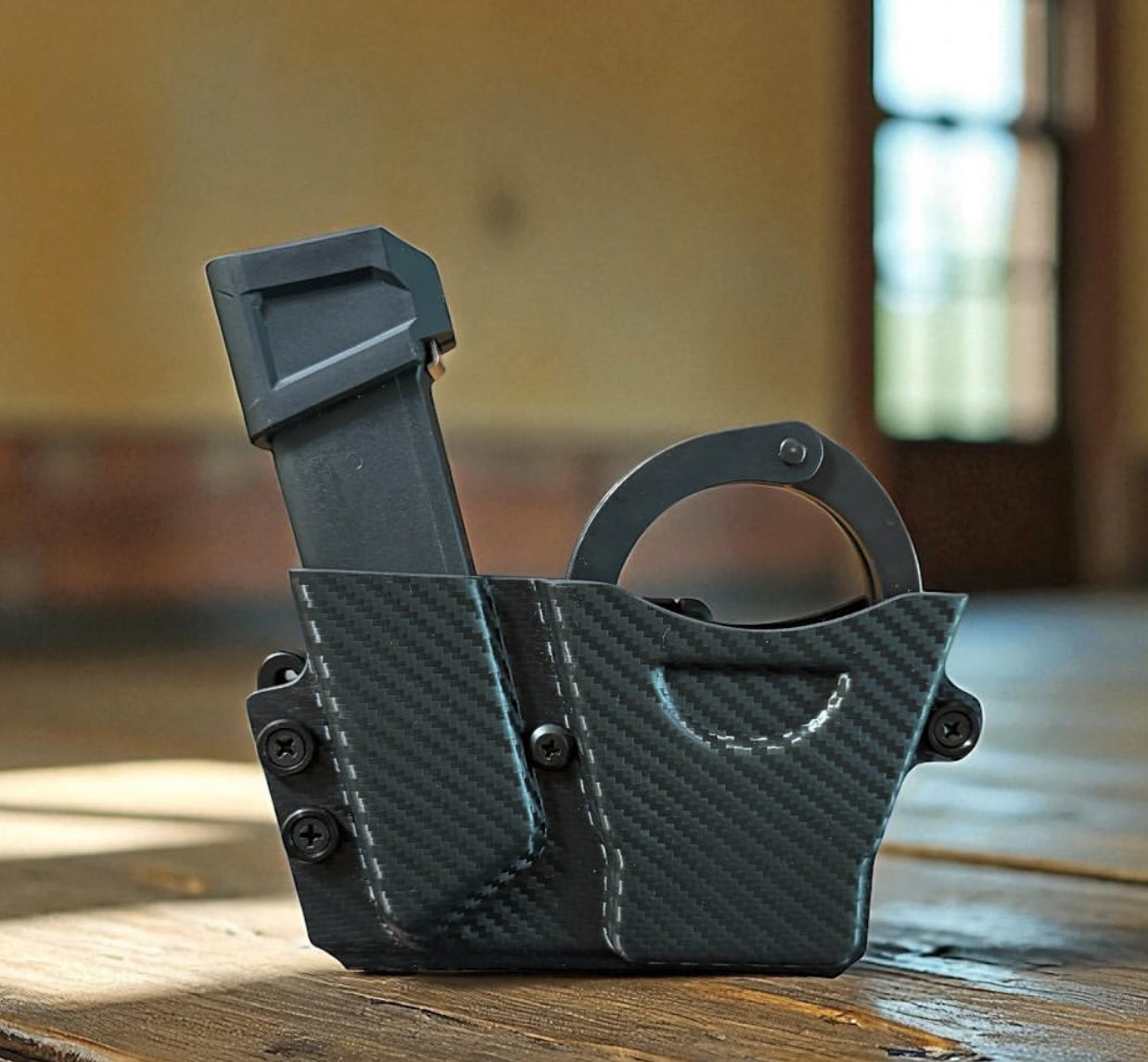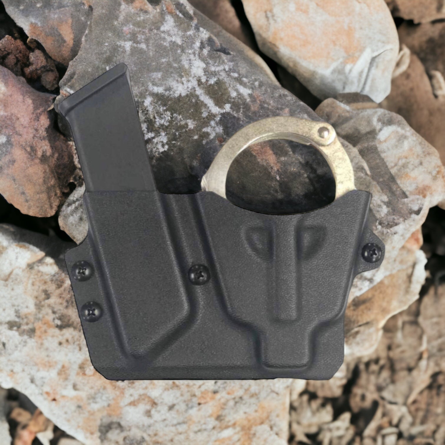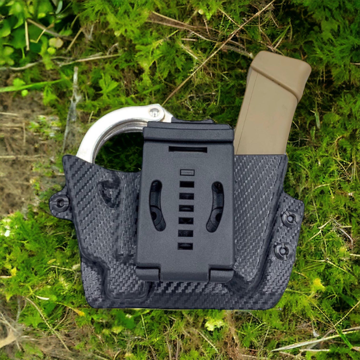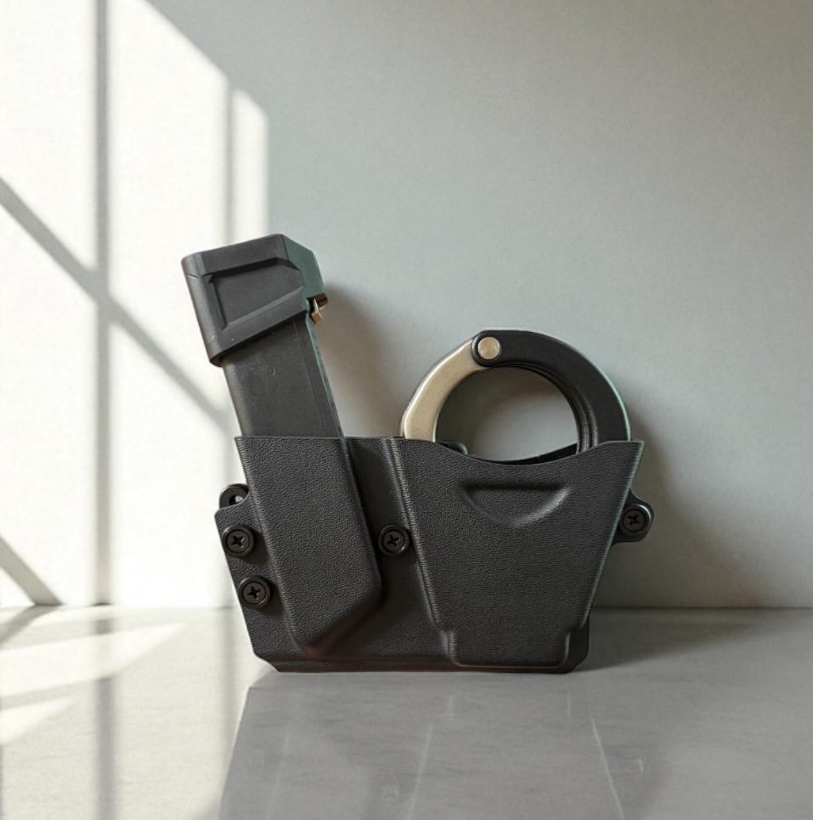 Handcuff + Pistol Mag Carrier: All of Handcuff & Mag Carriers are designed to fit your Peerless Chain, Peerless 801 Hinge, ASP Hinged, or Smith & Wesson chain cuffs perfectly. All our carriers are offer adjustable retention with two screws at the top of the carrier and a MRD (Magazine Retention Device) located near the mag for a better magazine fit. Works perfectly with all double stack 9mm, .357cal, and .40 cal magazines.