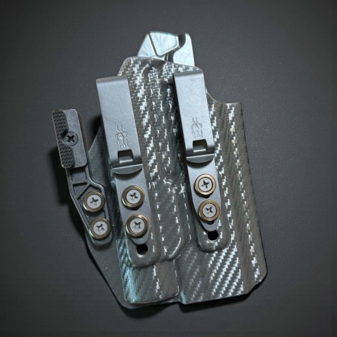 IWB Holster - Light Bearing: Here at Modern Patriot Holsters we take pride in giving our customers the absolute best in customized holster options. Our IWB Holsters are truly a work of art! We offer several kydex color options including carbon fiber and much more. Coupled with a multitude of belt attachment options to make your holster as simple or as complex as you desire. We finish each holster with your choice of colored finishing washers and screws. Stop searching for ordinary and make a holster that stands out of the crowd!