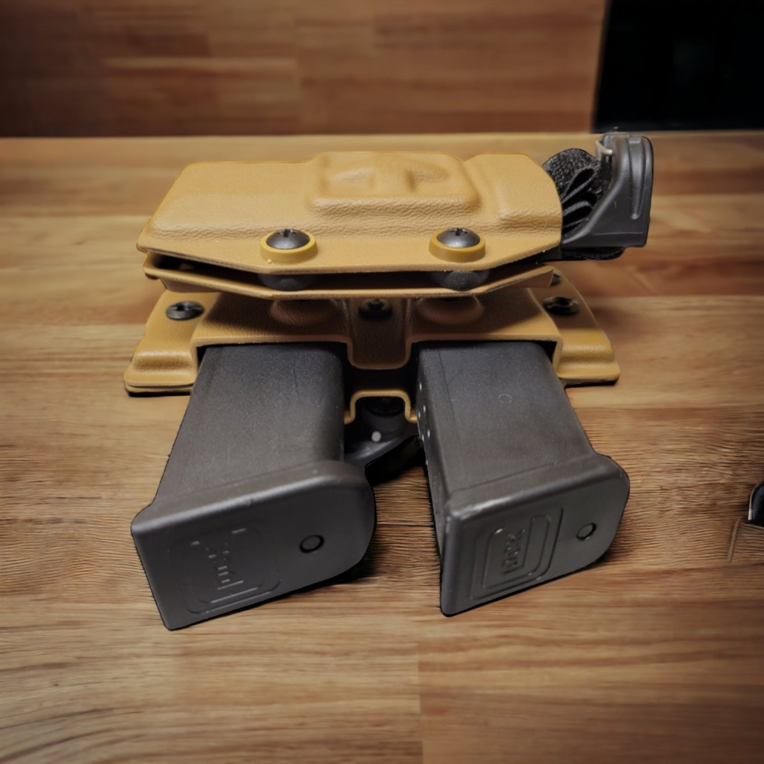 Tourniquet + Pistol Double Mag Carrier: Here at Modern Patriot Holsters we take pride in giving our customers the absolute best in customized mag carrier options. Our Tourniquet + Pistol Double Mag Carriers are truly a work of art! We offer several kydex color options including carbon fiber options. Coupled with a multitude of belt attachment options to make your holster as simple or as complex as you desire. We finish each holster with your choice of colored finishing washers and screws. Stop searching for ordinary and make a mag carrier that stands out of the crowd!